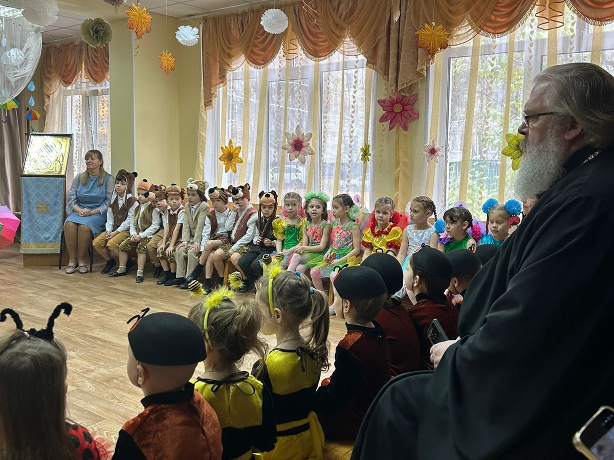 Торжественная часть началась с молитвы. Ведущая обратилась к детям и гостям с пожеланием мира под Покровом Пресвятой Богородицы. Воспитанники детского сада закружились в хороводе «Заглянула осень в детский сад», превратив зал в настоящую осеннюю сказку.